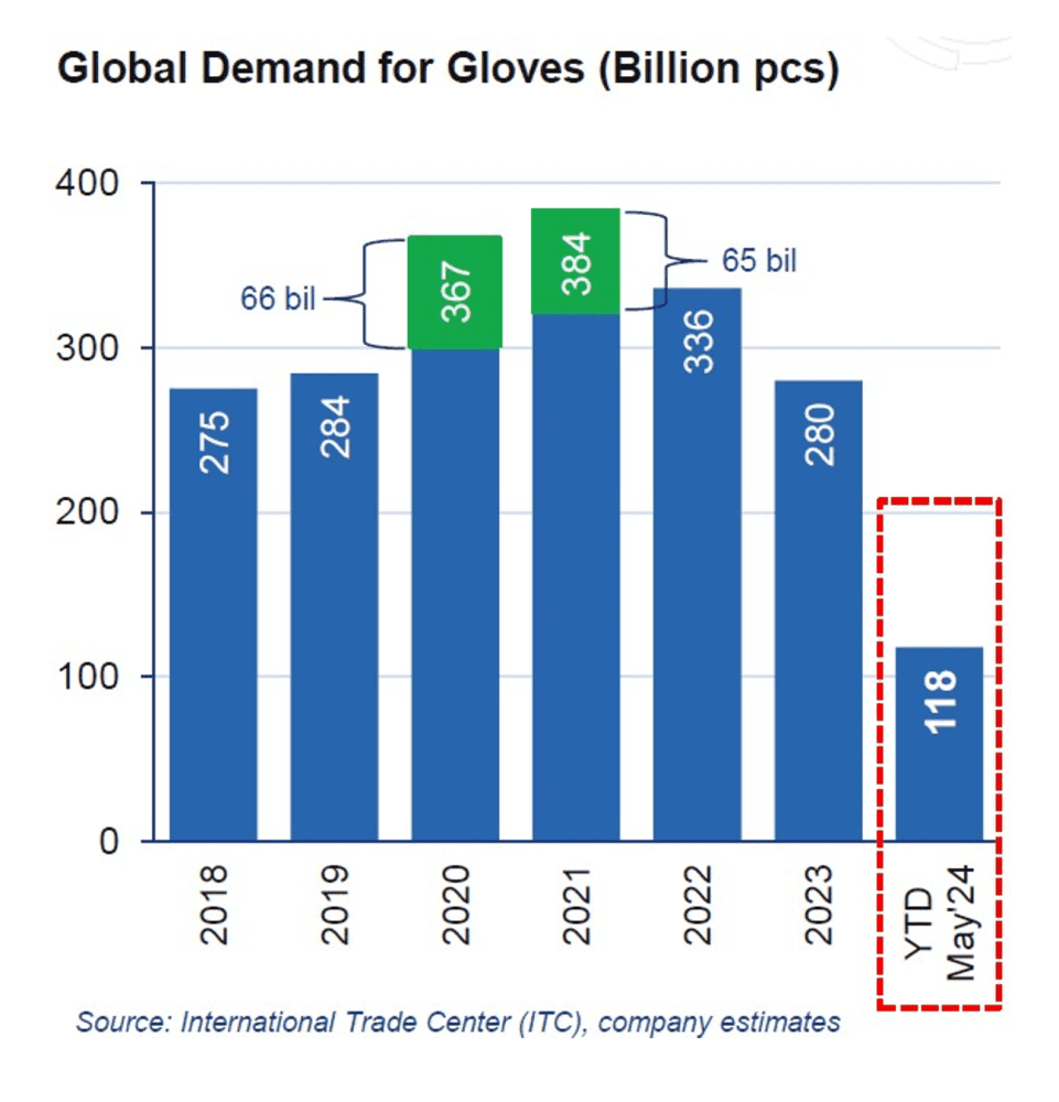 从历史上看,手套消费的复合年增长率一直保持在 6-8%,预计这一趋势还将继续保持下去。管理层坚信,公司的发展速度将超过行业增长速度。预计到在2024 年,手套需求量将超过 3000 亿只,到 2026 年将恢复到正常水平。