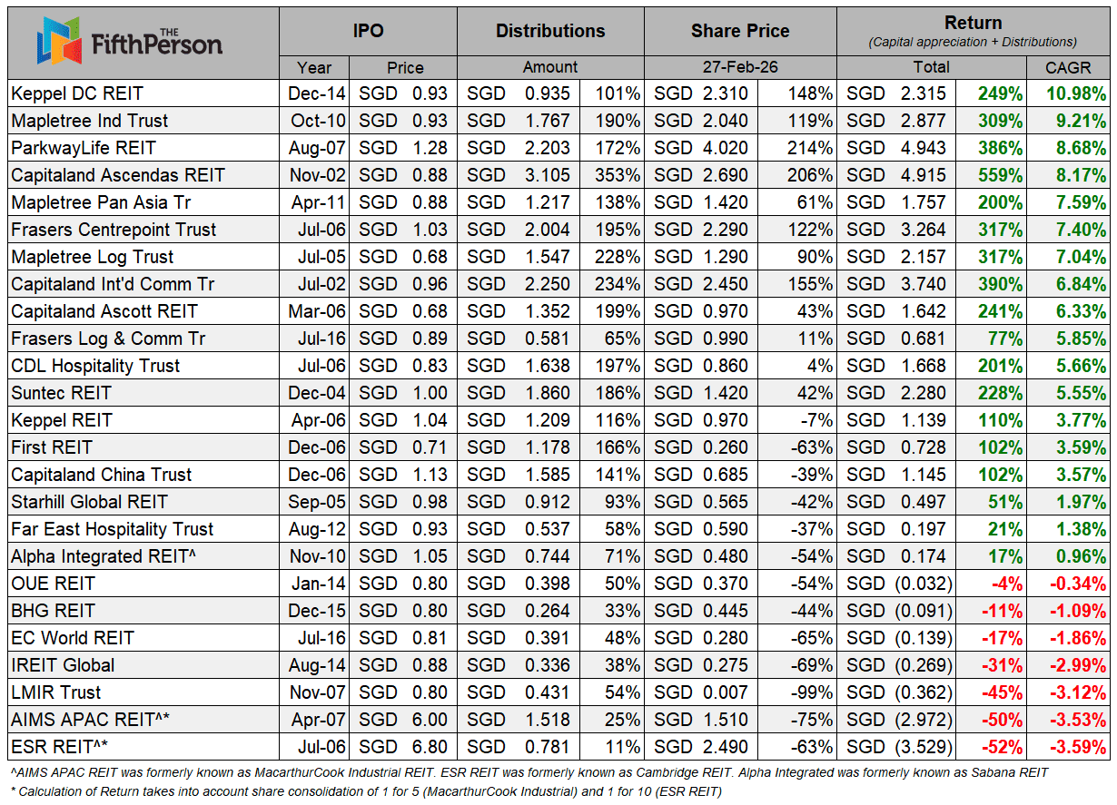 We first wrote about the performance of S-REITs ten years ago, and this time around we revisit their performance by taking into account the latest share prices as of end-February 2026 and the distributions paid to unitholders up to the same period. As before, a REIT needs to have at least 10 years of listing history for us to properly assess its underlying performance. I also make adjustments for factors such as unit consolidations and pre-consolidation distributions to present a more accurate picture of their long-term performance.