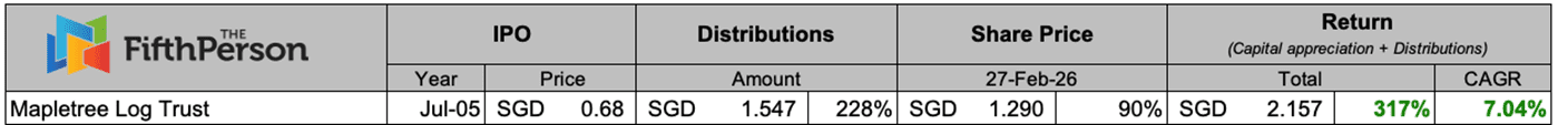For example, if John had invested in Mapletree Logistics Trust (MLT) during its IPO, his initial investment of $1,000 would have grown to $1,900 (+90% in capital gains) as of 27 February 2026. On top of that, he would have collected total dividends of $2,280 (+228% in distributions).