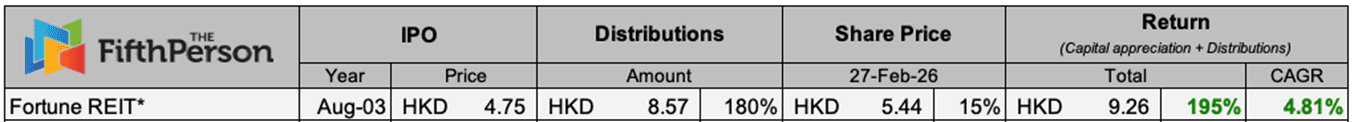 For example, if David had invested in Fortune REIT during its IPO, his initial investment of HK$10,000 would have increased slightly to HK$11,500 (+15% in capital gains) by 27 Feb 2026.