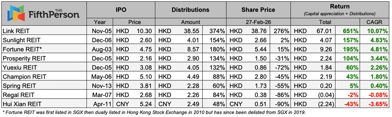 Similar to many Singapore and Malaysian REITs, Hong Kong REITs have generally delivered positive total returns—except for Hui Xian and Regal REIT. Hui Xian, for instance, declined by about 90% in terms of capital gains. However, when dividends accumulated over the years are included, the overall loss narrows to around 43%.